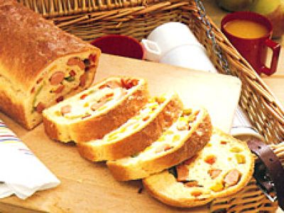 Dissoudre la levure dans le lait tiède.Épépiner les poivrons et les couper en petits dés.Dans un grand bol, créer un puits dans la farine.Incorporer la levure, les œufs, le sel et le beurre coupé en petits morceaux.Pétrir la pâte longuement jusqu'à ce qu'elle devienne élastique.Ajouter les poivrons à la préparation.Dans un moule à cake beurré, disposer successivement un tiers de la pâte, 3 saucisses, un autre tiers de la pâte, 3 saucisses, puis le reste de la pâte.Laisser lever la pâte dans un endroit chaud jusqu'à ce qu'elle double de volume (environ 3 heures).Cuire dans un four préchauffé à 210°C (thermostat 7) pendant 10 minutes, puis réduire la température à 180°C (thermostat 6) et cuire pendant 25 à 30 minutes.Démouler et laisser refroidir.