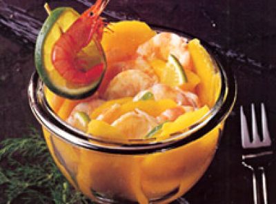 Incorporer les crevettes à la sauce et les disposer sur la mangue.