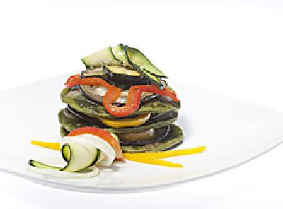 Sur une plaque recouverte de papier sulfurisé, disposez les légumes en superposition, au centre du mille-feuille, ajoutez la farce de chèvre, puis enfournez pendant 20 minutes.